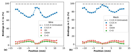 Finally, Figure 12 shows the bindings in C 1s obtained after the peaks deconvolution of the APPJ-treated samples using the components C-C/C-H, C-OH/R, C=O and COOH/R, whose binding energies are 285.0 eV, 286.7 eV, 287.8 eV and 289.2 ± 0.2 eV, respectively. The APPJ treatments performed with both wire and mesh configurations present reductions in the C-C/C-H components and increments in the C-OH/R, C=O and COOH/R ones as a consequence of the reduction in the C fraction and increase in the O fraction, respectively. It can be seen in Figure 12 that the longitudinal profiles of the C-C/C-H components and of the O-containing ones present similar shapes of the curves for the C and O element fractions (Figure 10), respectively. The linescan on the surfaces of the plasma-treated samples proves the insertion of O-containing functional groups (hydroxyls, carbonyls, carboxyls) across the line as the O-fraction is increased compared to the non-treated PP-material.