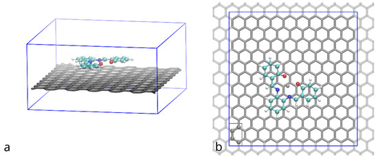 System under study (Figure 2) was enclosed in (approximately) 2.48 × 2.58 × 1.29 nm periodic box, which is enough to accommodate a supercell of graphene with 240 atoms (6 by 10 rectangular unit cells of the hexagonal graphene structure) and ensure lack of interaction of the compound with its periodic images.