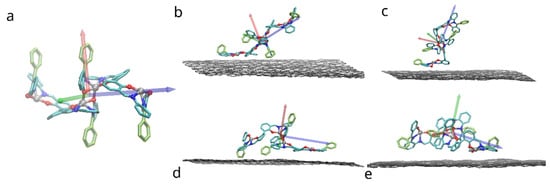 Placement of the bis-(Zn)salphen dimer with functional phenyl rings (highlighted with yellow) atop of graphene surface: (a) a compound dimer with axes indicating orientation, (b–e) variants of placement (after relaxation), axes indicate rotation of dimer. Only topmost graphene layer is shown for clarity, also solvent molecules and hydrogen atoms of compound are omitted.