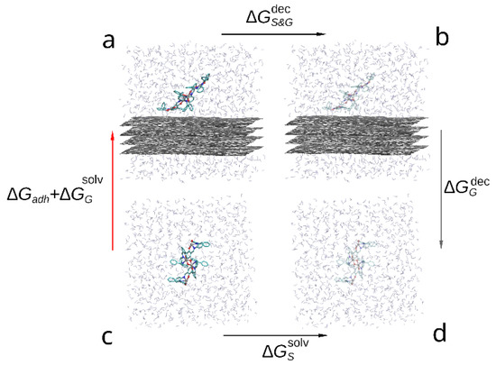 where —free energy of solvation of graphene sheets, —free energy change during decoupling of the adsorbed compound dimer from surrounding solvent and graphene molecules, —free energy change during decoupling of the graphene from solvent and —free energy of solvation of the compound. Since within FEP formalism, decoupling of the compound from solvent is the opposite of solvation (immersion into solvent), the solvation free energy is the negative of the decoupling free energy: . Using this substitution in Equation (3) the desired free energy of adhesion to graphene in solvent can be estimated as follows: