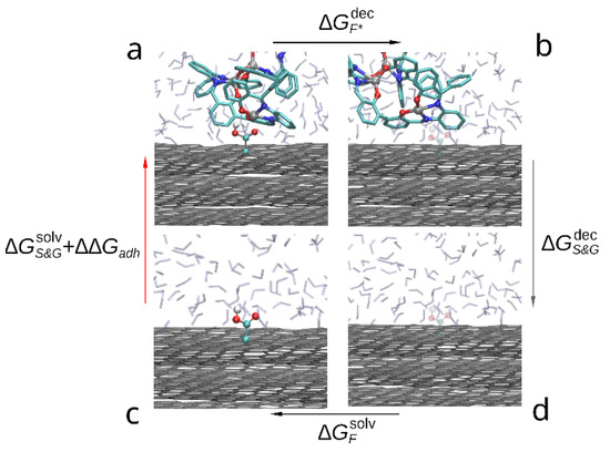 The thermodynamic cycle corresponding to this study is shown in the Figure 4. The red arrow indicates the transition of interest between solvated (c) and adsorbed compound (a) as the free energy change between these states contains the free energy of adhesion (). While it is possible to estimate it directly by steered molecular dynamics, due to large capacity of the compound dimer to deform and change conformation a large number of slow simulations would be required to accurately sample the PMF change during slow approximation or detachment of the compound molecules. Instead, we estimate the indirectly by: