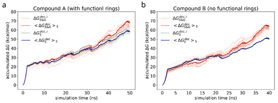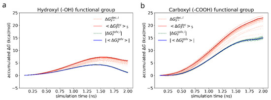 Figure 10a shows a non-monotonous shape of the accumulated over the course of simulation in case of hydroxyl group, which is the result of the interplay between electrostatic attraction, scaling in close proximity of the atoms being immersed or decoupled as −λ/(1−λ)), dispersive attraction (~ −λ/(1−λ)2), and core repulsion (~ + λ/(1−λ)4) of the soft Lennard-Jones potential between the surrounding molecules and the functional group [64,65,66]. The same processes occur in case of carboxyl group as well (Figure 10b), however, due to much stronger electrostatic attraction to the solvent molecules, the time dependency of the free energy change looks almost monotonic.