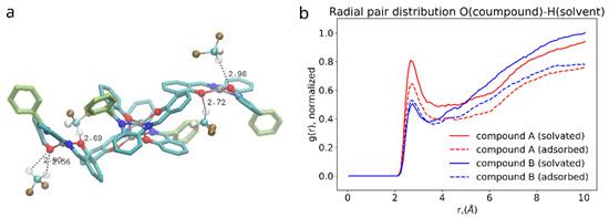 (a): 3D rendering of interaction between salphen’s oxygen and hydrogen of the DCM. (b): radial pair distribution function corresponding to this interaction for solvated (solid lines) and adsorbed (dashed lines) dimers.