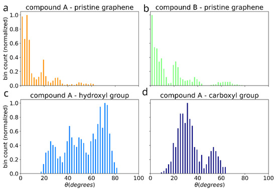 Distribution of the angle between the dimer axis (blue arrow in the Figure 3) and graphene plane for the cases of: pristine graphene with compounds A (a) and B (b), as well as for compound A adsorbed on graphene with -OH (c) and -COOH (d) functional groups.