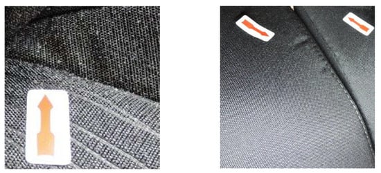 The image processing method worked for monochromatic woven samples. However, when we started testing samples in which the top fabric had a distinctive large or unsmooth pattern, problems with identifying the defect occurred. The examined defect began to blend with the textile pattern, and the shape of the textile pattern merged with the examined defect, which caused an error in the evaluation, and the defect was not detected, as shown in Figure 5. Therefore, we started looking for a new way of appearance defect evaluation.