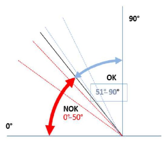 The investigated appearance defect of a textile laminate is still evaluated according to the Spanish standard [22] by a simple method based on the principle of bending the textile. A 170 × 70 mm2 textile sample is placed on a small jig, see Figure 2, consisting of two arms. One arm is stationary, and the other one can rotate. In the starting position, both arms are horizontal; the rotation angle is 0°. Subsequently, one end of the textile sample is fixed to the stationary part of the jig, and its other end remains free. The experimenter starts turning the movable arm of the jig up to the moment when a wrinkle appears on the bent fabric from one edge to the other. At that moment, the experimenter reads the rotation angle on the protractor. According to the standard, the boundary angle for determining the quality of the textile is 50°, see Figure 3. A defective textile, i.e., NOK, shows an angle ≤50°; in contrast, a high-quality textile, i.e., without any defect, shows angle values >50°.