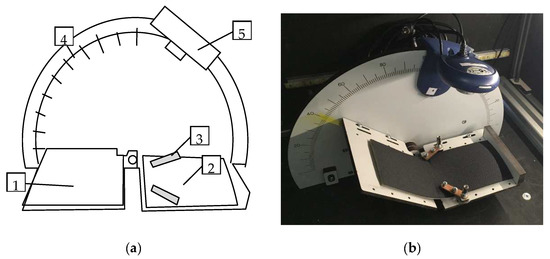 The innovated device called SAHF-W: (a) the scheme of device 1—rotating arm; 2—stationary arm; 3—fixed clamps; 4—protractor scale; 5—camera; (b) photo of the produced device.