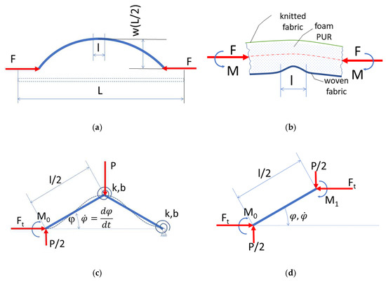 A model of textile laminate test sample of length L: (a) a sample of length L is subjected to horizontal forces F at both ends; (b) the fabric is pressed into the PUR foam mass, i.e., the textile laminate loses its shape stability; (c) a one-step fabric model; (d) the bending moment equilibrium equation of the free arm.