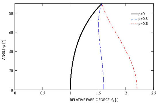 Using the MathCad11 software environment, the plot of the functions f0(φ, p) for p = 0, 0.3, 0.6 the Equation (5) is shown in Figure 9. The functional dependence without the influence of the polyurethane foam (p = 0) is highlighted in black in the plot.