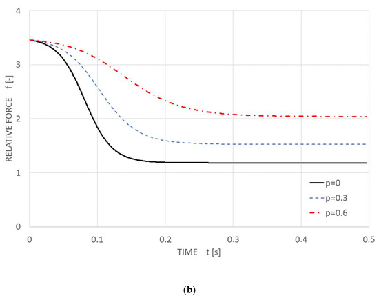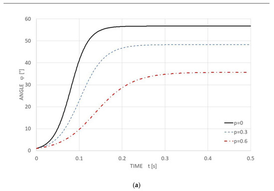 According to Equations (3) and (4), the time progression of the arm inclination angle φ in Figure 10a and the dimensionless fabric force f(t, φ) in Figure 10b, respectively, are in the time interval t from 0 to 0.5 s.