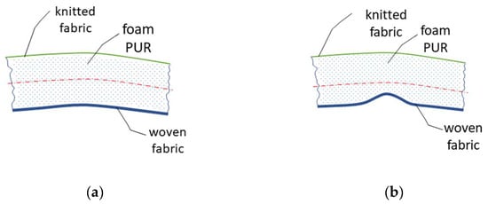 The individual layers of the laminate affect its final properties. It is known from the theory of simple bending that, in a layered material, different values of EJ (bending rigidity) in each layer can cause a displacement of the neutral plane, which affects the resulting bending rigidity of the laminate, Figure 11. The appearance defect that we are examining on the textile is visible when we turn the laminate over so that the knitted fabric becomes the top layer and the woven fabric the bottom layer, see Figure 11a. The different bending rigidity of each layer of the laminate becomes evident when the laminate is bent as a whole. If the top layer (woven fabric) is flexural and soft, this fabric will most likely not have the tendency to create bending fractures and push through the second layer, which is the PUR foam. If the top layer of the textile laminate is significantly stiffer in bending, the value of the neutral plane will shift, and the laminate will begin to show a tendency for the top layer—the fabric—to break into the second layer of PUR foam, as demonstrated in Figure 11b. The bending rigidity of the fabric is affected by several parameters, for example, the type of fibre used, the structure parameters of yarn or fabric, such as the number of twists of the yarn, the density of weft or warp, the type of weave, etc. The problem of compression plate buckling behaviour of rubber and laminate fabrics is examined in the works of the authors [29,30].
