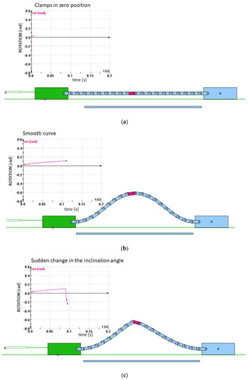 The simulated progress of textile buckling of the discretized model of the investigated textile laminate sample in the Working Model 2D program environment at a clamp distance of 110 mm: (a) the starting position; (b) the buckling without the loss of shape stability; (c) the loss of shape stability.