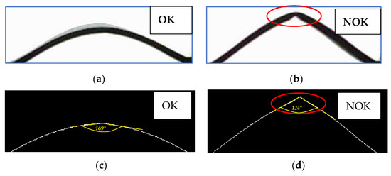 Textile profile photo processing for fabric type GC: (a) textile GC-u is OK—without loss of stability; (b) Textile GC-o is NOK– loss of stability detected; (c) the curve and the deformation angle reading; (d) the angle of deformation of the textile after its loss of stability.
