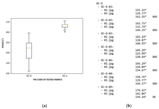 The example of results of the examined textiles: (a) the box diagram of results; (b) measurement results saved as a text file for the tested fabric type GC-O.