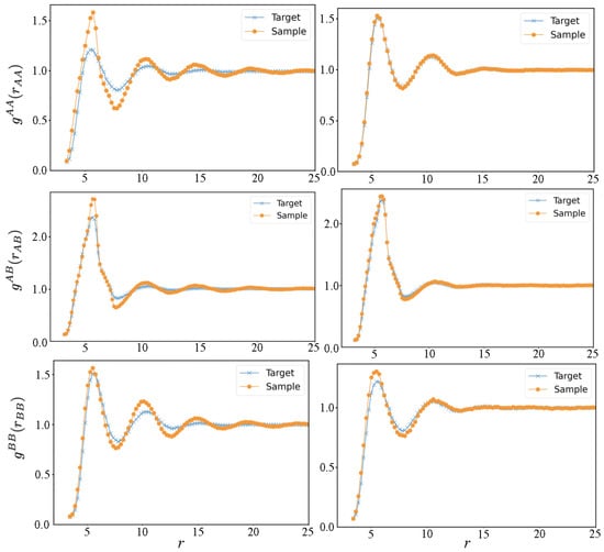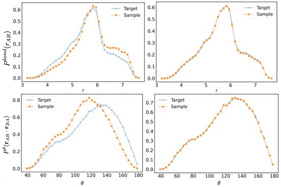 where the distributions with the subscript are the target distributions obtained in the AA system and the parameter is numerically adjusted to reach the desired convergence. The distance range, , considered to generate the CG potential, was taken into the range from zero up to the interaction cut-off value, Å, to account the long-correlation effects. The CG potential at distance larger than is assumed equal to zero by construction. The rules in Equation (3) simply state to decrease the interaction potential (so that the distribution will be hopefully increased in the successive step) if the obtained distribution (or ) is lower than (or ) and to increase the potentials in the opposite case. The initial guess of the potentials are obtained using Equation (2) and the target quantities or . The target (this is needed only in the initial step of the algorithm) and CG distributions were sampled by an NVT ensemble (5 ns trajectory) at 400 K, chosen as the typical operating temperature of the photopolymerization in 3D-printing process, simulated using the Nose–Hoover chain dynamics as implemented in Lammps [30]. The system size of the AA and CG atoms were, respectively, of 6912 and 1152 atoms corresponding to a box length of about 65 Å, the timestep was set to 1 fs for both CG and AA system. In Figure 2 and Figure 3, the initial and final distribution functions compared with the targets are reported. A total of 28 steps of IBI update rules given in Equation (3) were performed, and the parameter was set between 0 (at some point of the iteration steps, the update of short-range potentials is no longer needed) and , depending on the iteration step and interaction type. The accordance is very good considering the moderate computation cost: a trajectory of the CG system is calculated in less than one hour using 8 CPU cores.