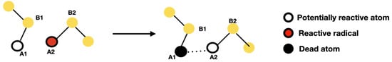 The classical reactive molecular dynamics is used to model the evolution of the double bond conversion occurring in the propagation step. In particular, a topological approach is usually exploited to describe the breaking of the double bond and the consequent formation of a new covalent bond [24,25]. In the LAMMPS code [30], two different topological reactive approaches are available. In the first, pre- and post-templates provide all the topological information, such as type, bonds, angles, dihedrals, of the molecular structures before and after the covalent bond formation between reactive atoms by the bond/react fix package [25]. In the second approach implemented in the bond/create package, a new bond is added between pairs of reacting atoms whenever a specified criterium is verified. In particular, whenever a reactive carbon is below a prescribed distance from a reactive vinyl group (-CH=CH2), the algorithm proceeds to create a new covalent bond (see Figure 4). Consequently, the carbon atoms change type due to the double bond conversion, and a new set of topological information is inserted, including the new bond between the carbon and the vinyl group and the two new angles beside the radical site. In the following, we use the bond/create package implemented in the LAMMPS code [30]. Hence, whenever a radical atom and a potentially reactive carbon atom get closer than a distance threshold, the reaction occurs, and the radical site is transferred to the reacted monomer. Then, the last reacted radical site becomes a dead site after the radical transfer, and the force field interactions of the system need to be updated according to the new topology (newly added bond). Note that in the following, we will refer to the distance threshold as the reactive cut-off distance different from the interaction cut-off, , previously defined. Further, it is worth highlighting that the topology matching algorithm with the CG system description requires less detailed templates to describe the pre- and post-reacted topology, as compared to the AA description, thereby reducing the computational costs of the topology identification step.