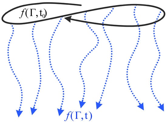 where denotes the value of the observable, , assumed at time t along the i-th trajectory started from the phase-space point, (see sketch in Figure 5). In the present work, we assume that is the PDF of a system at a constant number of atoms, temperature, and volume without any double bond conversion.