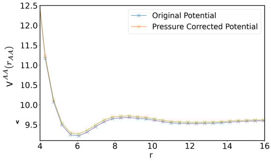 Pressure corrections can be, in general, used in the IBI scheme whenever the CG potential shows a pressure discrepancy from the target value of the AA system [40]. Equation (9) adds a weak linear potential term to the attractive long-range part of the potential obtained from the iterative procedure of Equation (3). Note that the correction term is applied as an a posteriori correction applied to the force field obtained from the IBI procedure. Thus, the parameter in Equation (9) is adjusted to obtain a pressure of the polymerized CG system close to the target pressure, keeping the interaction cut-off value Å. Note that the correction parameter is negative or positive depending on the pressure, which can be above or below the target value. In our case, with kcal/mol, we obtained a scaled form of the CG force field, of which the potential function of the term AA is reported as an example in Figure 7. In the polymerization process, whenever a CG atom is dead, the CG atom changes type, and its interaction potential with all other atoms of type A is changed to . Using this simple strategy, we were able to avoid the density inhomogeneity in the polymerized system while maintaining the pressure values until about of the double bonds correction, much more close to the target system pressure measured in the AA system: respectively, for the and cases, we obtained a pressure of −9(± 1), −15(± 2), and −11(± 2) atm for the CG-corrected force field. However, in the CG simulations, we still observe a deviation of about 20% in the volume shrinkage, indicating a pathological behavior that could likely be corrected using more complex force fields, such as the embedded-atom method potentials proposed by Daw and Baskes [37,41].