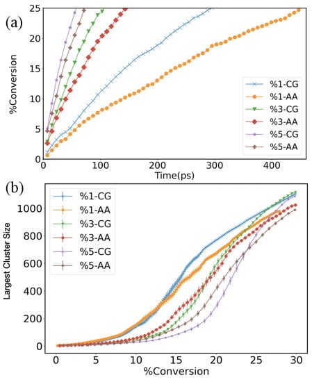 (a) Double bond conversion as a function of simulation time averaged by D-NEMD for the full-atomistic (AA) and the coarse-grained (CG) force fields at different initial radical concentrations. (b) Largest cluster size in function of double bond conversion. The curves were used to calculate the gel points.