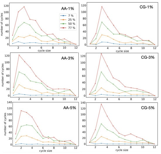 Cycles size distribution for the AA (from Ref. [10]) and CG systems at different stages of the polymerization process in double bonds conversion values and different initial radical concentrations. The distribution was computed as the mean over a set of 20 independent trajectories. The standard deviation (not reported in figure) was found to be always less than 5% of the corresponding mean values.