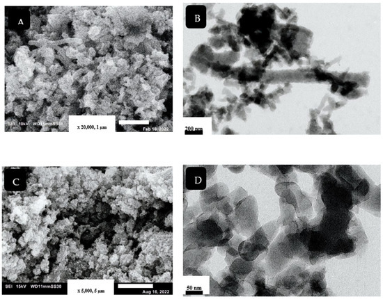 SEM and TEM images for PANI (A,B) and PANC (C,D), respectively.
