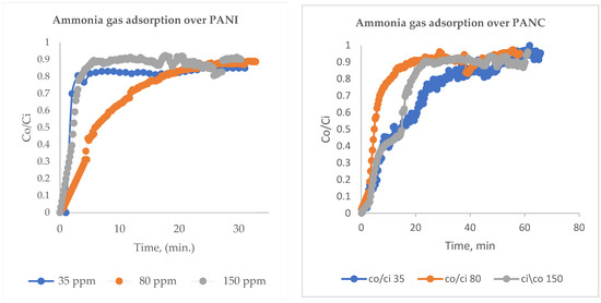 Standard NH3 concentration was prepared by mixing it with nitrogen (N2) gas. Both gases were passed through a mass flow controller and mixed homogeneously using several Y-connection consecutively, and then passed through long tubing to be measured using an NH3 (Drager Polytrone 5000) sensor [25]. Different NH3/N2 concentrations were prepared in the range of 35–150 ppm, as seen in Figure 1. The adsorption experiments were performed by entering the feed gas mixtures into a PANI and PANC nanocomposite fixed bed reactor. The bed consists of a glass tube with a dimension of 8 cm in length and 0.7 cm internal diameter. The gas adsorption experiments were attained until C/C0 = 0.90. The adsorption capacity of PANI and PANC nanocomposite towards NH3 was assessed by integrating the area under the breakthrough curve, as seen in Figure 1 [26].