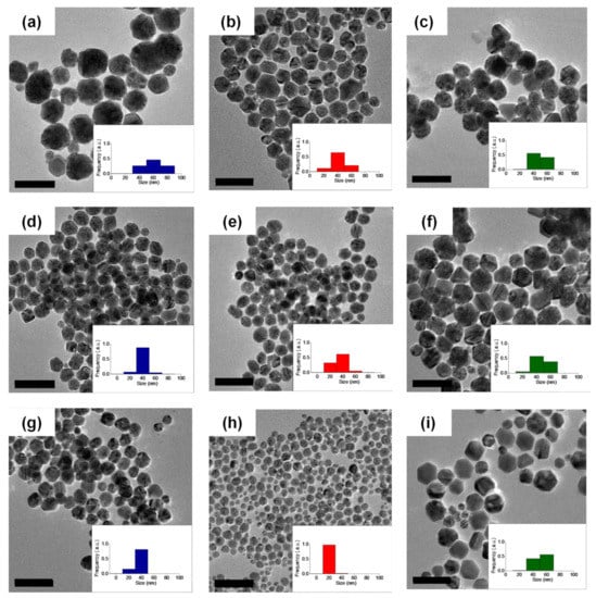 TEM micrographs of AgNPs prepared in the presence of (a) HO–PEG5k–OH (ω = 2.2), (b) c-PEG5k (ω = 2.2), (c) MeO–PEG5k–OMe (ω = 2.2), (d) HO–PEG5k–OH (ω = 11), (e) c-PEG5k (ω = 11), (f) MeO–PEG5k–OMe (ω = 11), (g) HO–PEG5k–OH (ω = 44), (h) c-PEG5k (ω = 44), and (i) MeO–PEG5k–OMe (ω = 44) (Scale bar: 100 nm).