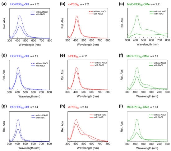 Relative UV–Vis absorption spectra of AgNPs without NaCl (dashed line) and with 37.5 mM of NaCl (solid line) in the presence of (a) HO–PEG5k–OH, (b) c-PEG5k, (c) MeO–PEG5k–OMe at ω = 2.2, (d) HO–PEG5k–OH, (e) c-PEG5k, (f) MeO–PEG5k–OMe at ω = 11, (g) HO–PEG5k–OH, (h) c-PEG5k, and (i) MeO–PEG5k–OMe at ω = 44.