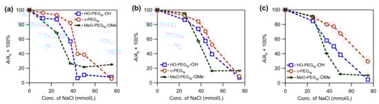 Plots of relative UV–Vis absorption intensity (A/A0 × 100%) at λmax versus the NaCl concentration for AgNPs prepared in the presence of HO–PEG5k–OH (blue), c-PEG5k (red), and MeO–PEG5k–OMe (green) at (a) ω = 2.2, (b) ω = 11, and (c) ω = 44.