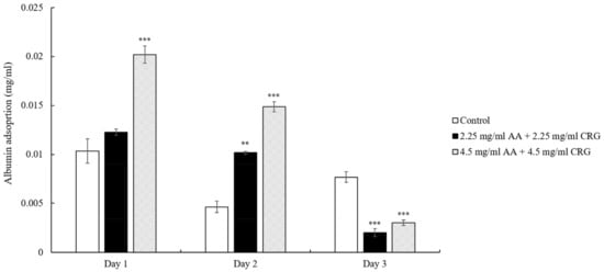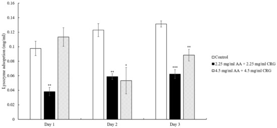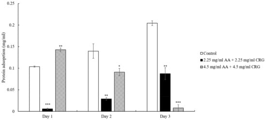 | 2.25 mg/mL AA + 2.25 mg/mL CRG | 29.32 | 29.7 | 24.41 | 27.81 ± 2.95 |