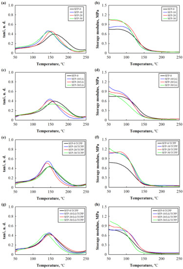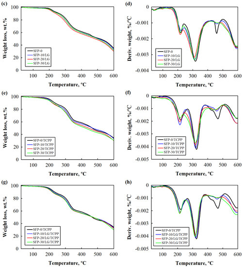 Slightly different observations could be found for the flame retardant PUR foam composites with SFP and LG/SFP fillers (Figure 2e,g). Compared to the control flame retardant PUR foam (SFP-0/TCPP), a 30 wt.% SFP filler increased the Tg from 145 °C to 149 °C, while a 20 wt.% LG/SFP filler increased the temperature to 147 °C.
