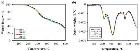 This was related to the cellulose and hemicellulose in the SFP and SFP/LG fillers [46]. These polysaccharides expedite the conversion of volatile gases from PUR. Slightly lower values for Tmax1 were suspected for the PUR foam composites with SFP and SFP/LG fillers and were related to the insufficient dispersion and formation of clusters into the PUR system, which can alter the cross-link density of the products [47]. However, the addition of the non-flame retardant SFP or SFP/LG filler did not change the temperature in the first stage, indicating a sufficient filler dispersion and cross-link density of the resultant PUR foam composites, while the incorporation of flame retardant fillers gave rather lower results. The Tmax2 was observed to be lower for the SFP and SFP/LG filler-modified PUR foam composites. This could be associated with the fact that at this stage, cellulose (~25 wt.% SFP), hemicellulose (~15 wt.% SFP), and lignin (~9 wt.% SFP) start to degrade [48]. However, the degradation peak temperature associated with the third stage indicated that the LG slightly shifted towards the DTG curve compared to the control PUR foam (SFP-0), which could be related to the fact that the reaction between the isocyanate and the SFP/LG filler cross-linked the polymer structure of the non-flame retardant and flame retardant PUR foam composites.