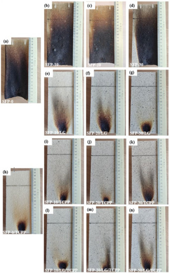Ignitability experiment on: (a) SFP-0; (b) SFP-10; (c) SFP-20; (d) SFP-30; (e) SFP-10/LG; (f) SFP-20/LG; (g) SFP-30/LG; (h) SFP-0/TCPP; (i) SFP-10/TCPP; (j) SFP-20/TCPP; (k) SFP-30/TCPP; (l) SFP-10/LG/TCPP; (m) SFP-20/LG/TCPP; and (n) SFP-30/LG/TCPP.