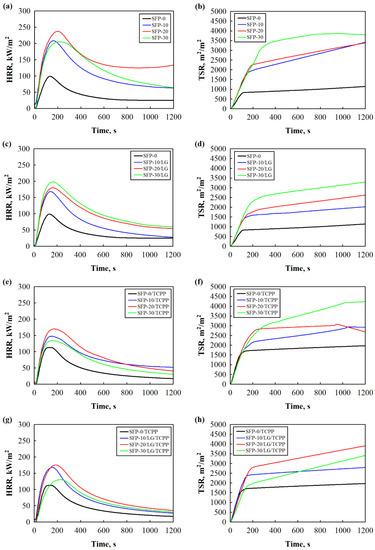 HRR and TSR of: (a,b) PUR foams with SFP filler; (c,d) PUR foams with LG-modified SFP filler; (e,f) flame retardant PUR foams with SFP filler; and (g,h) flame retardant PUR foams with LG-modified SFP filler.