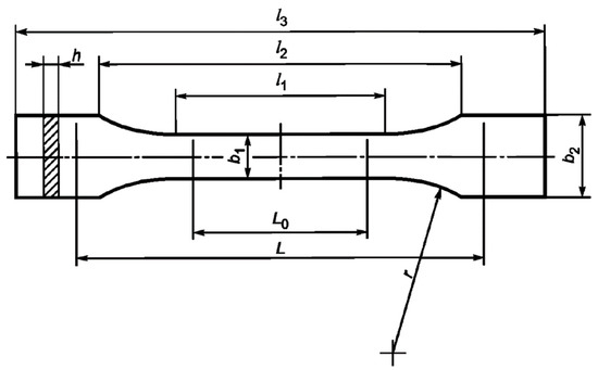Tensile test sample. Dimensions, in mm: l1 = 80 ± 2, l2 = 109.3 ± 3.2, l3 = 170, L0 = 75 ± 0.5, L = 115 ± 1, b1 = 10 ± 0.2, b2 = 20 ± 0.2, h = 4 ± 0.2, r = 24 ± 1.
