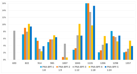 The content of compounds I–X (Table 2) in samples PNA-BPF-1 ÷ 5 ((1)–(5), respectively).