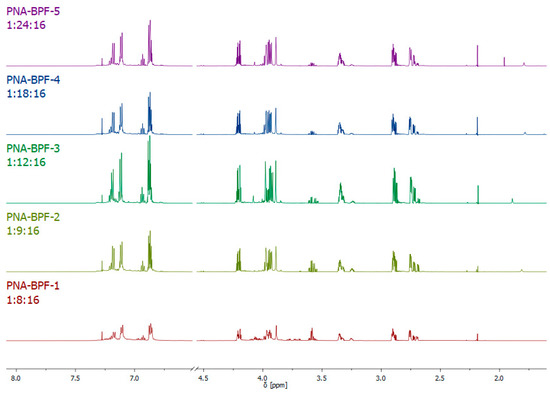 Table 5 shows the PhER yields depending on the ratios of the initial reagents. The values of the yields of syntheses 1–5 are close and are associated with losses during filtration from salts during the isolation process. The lower yield in the synthesis of PNA-BPF-S-1 is associated with the formation of sparingly soluble oligomers, which were deposited on the filter along with the salt during filtration, which also affected the deviation in the epoxy number.