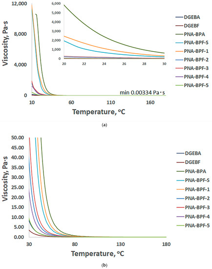 Temperature profile of viscosity versus temperature of obtained PhER, (a) from 10 to 180 °C and from 22 to 26 °C, and (b) from 30 to 170 °C, respectively. PNA-BPA—epoxy resin obtained by the method in [52] at a ratio of HCP:BPA equal to 1:9.