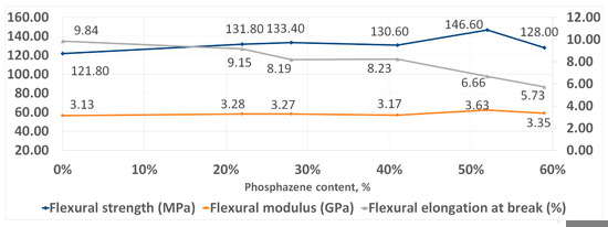 With an increase in the phosphazene fraction, first, an increase in the strength and elasticity of the cured PhER during tensile testing was observed, then a tendency to a decrease in tensile modulus (Figure 8). In flexural tests, an increase in strength was also observed, while the trends in elasticity and flexural modulus were different to tensile tests: the flexural elongation at break continuously decreased with increasing content of the phosphazene fraction, while flexural modulus remained unchanged (Figure 9).