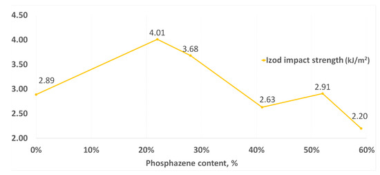 Similar dependencies were also observed when testing for impact strength (Figure 10). With a decrease in the phosphazene fraction, the impact resistance increased to its maximum in the synthesis of PNA-BPF-5, but at the same time it decreased again for the DGEBF epoxy resin, which does not contain epoxyphosphazenes. Based on this, one can talk about the existing modifying property of epoxyphosphazenes based on bisphenol F with respect to the base DGEBF resin. The modifying effect is most likely maximal at the content of the phosphazene fraction in the range of 10–25%. A similar dependence was observed earlier in the study of the properties of PhER based on bisphenol A in [58].