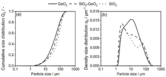All bulk glass materials were crushed with pestle and mortar and sieved to a size below 125 µm prior to the comminution experiments inside SMM. Cumulative particle size distributions Q3 of the glass feeds where measured via laser diffraction and are showcased in Figure 1.