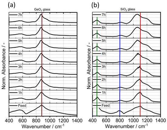 From Sauter diameter d3,2 analysis, a particle size reduction was observed for the first 4 h of comminution. Further stressing did not lead to any significant size reduction of the glasses and suggests plastic deformation due to mechanical energy input, rather than brittle breakage. Possible structural changes of the stressed glasses were investigated in terms of Fourier transform IR spectroscopy. A similar result can be observed from the derived IR spectroscopy data. Figure 4 and Figure 5 showcases the IR spectra of GeO2 glass (a) and SiO2 glass in the wavenumber range of 400–1400 cm−1 with their corresponding spectra with increasing comminution time. The spectra were normalized using the maximum absorption value of the respective glass system. Table 6 showcases the IR-bands evaluated in this study.