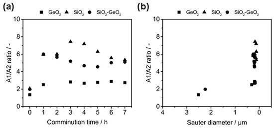 Figure 6 showcases the A1/A2 ratio against the Sauter diameter and comminution time, where A1 and A2 correspond to the absorption of the 1100 cm−1 and 800 cm−1 bands of the SiO2 glass, respectively according to the method first published by Iwao [66]. The A1/A2 ratio represents the proportion of asymmetric stretch vibration to symmetric stretch vibration of Si-O-Si, which can be considered as a measure of structural disorder. In case of the pure GeO2 glass, the peaks A1 and A2 refer to the absorption bands observed at 550 cm−1 and 870 cm−1, which can be assigned to the asymmetric stretch vibration and sym-metric stretch vibration of the Ge-O-Ge bond, respectively. All glasses show, that the A1/A2 ratio is significantly increased from a value of ~2 of the feed glasses to more >6 for the SiO2 glass flakes and to ~3 for GeO2 glass flakes, which represents a significant struc-tural deformation of the homogeneous glasses. The mixed SiO2-GeO2 glass displays a mixed behavior of both glasses, which can be seen as a good indication, that both feeding materials formed a homogeneous glass mixture during melting and resulting in a glass with mixed properties of both glass forming constituents.