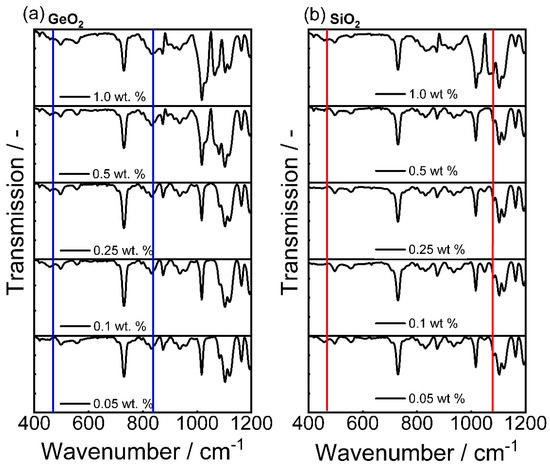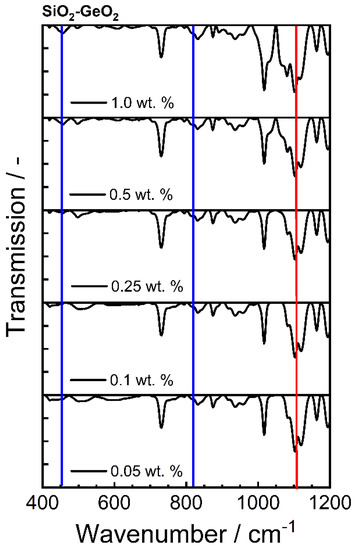 IR spectra of the different PBT-PC-SiO2-GeO2 blends. Bands are taken from Table 6, blue represents GeO2 bands and red represents the SiO2 band.