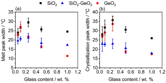 The results of the decrease in both, melting peak width and crystallization peak width, can be explained by several effects. First reason are the different thermal conductivities of the glasses. It is known [73] that the thermal conductivity of SiO2 increases significantly with the addition of GeO2. Not only increases GeO2 the thermal conductivity, it also has lower specific heat capacity (cp) in comparison with SiO2 that means, that much less thermal energy is needed to increase the temperature of GeO2 and therefore the thermal energy is available to heat/cool down the polymer composite. The specific heat capacity of GeO2 (cp,GeO2 ~0.5 J g−1 K−1) [74,75] whereas the specific heat capacity of SiO2 (cp,SiO2 ~0.72 J g−1 K−1) [76], which leads to an averaged specific heat capacity of the SiO2-GeO2 mixture of cp,SiO2-GeO2 ~0.6 J g−1 K−1. These effects in combination are reducing the peak width as is observed in Figure 12.