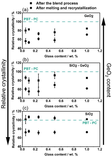 Influence of the glass content on the relative crystallinity of the PBT-PC composite. (a) GeO2; (b) SiO2-GeO2; (c) SiO2.