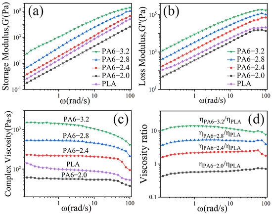 Viscoelastic behavior of PA6 and PLA at 230 °C and viscosity ratio of PA6/PLA: (a) storage modulus (G′), (b) loss modulus (G″), (c) complex viscosity (η*), and (d) viscosity ratio of PA6/PLA.