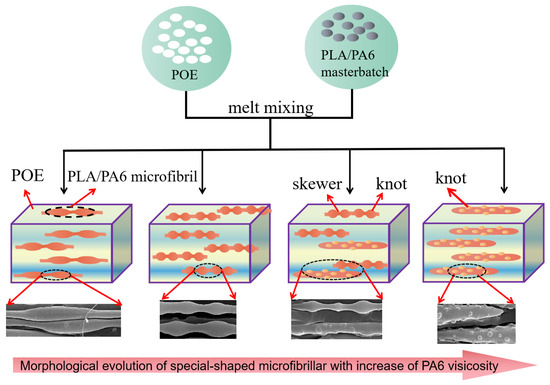 Herein, in this study, the PA6/PLA master batch with different PA6 viscosity was chosen as a dispersed phase to prepare the POE-based MFCs through the technology of multistage stretching extrusion. The influence of the viscosity ratio of PA6 to PLA on PA6/PLA special-shaped microfibrillar morphology evolution was examined. In addition, the mechanical, rheological, and crystallization properties affected by the morphology of special-shaped microfibrils were carefully investigated.