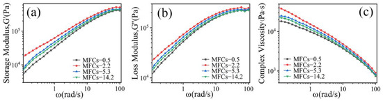 Figure 4 shows the dependence of storage modulus(G′), loss modulus(G″), and complex viscosity (η*) on angular frequency(ω) for in situ POE/(PA6/PLA) MFCs at 130 °C. It was evident that the G′ and G″ of all the specimens increased with increasing angular frequency (Figure 4a,b). At low frequencies, the G′, G″ of POE/(PA6/PLA) blends increased linearly. At high frequencies, the frequency-dependence of G′, G″ was substantially weakened and a small platform appeared due to the frequency’s response difference of PA6/PLA microfibrils physically entangled network. The information of situ microfibrils made effective contributions for not only the elastic behavior, but also the viscous behavior. Sun et al. [18] had the similar conclusion about the research of POE/PLA microfibrillar composites fabricated through multistage stretching extrusion. From Figure 4c, it can be seen that all the specimens exhibited shear thinning behavior, indicating that the in situ POE/(PA6/PLA) blends were non-Newtonian fluids, which was similar to the POE/PTT microfibrillar composites [15]. With the increasing of ω, the η* of POE/(PA6/PLA) blends decreased continuously. This result can be ascribed to the de-entanglement of POE chain and the PA6/PLA microfibril remain highly oriented (PA6/PLA microfibrils were solid-state at 130 °C). In addition, with the increasing of viscosity ratio of PA6 to PLA, the G′, G″ and η* of POE/(PA6/PLA) blends increased firstly and then decreased at the same ω. When the viscosity ratio of PA6 to PLA was 2.2, the viscoelastic properties of POE/(PA6/PLA) blends was maximum, revealing that the “gourd skewers” structure microfibrils with a small diameter and length of knots was favorable to improvement the viscoelastic properties of POE/(PA6/PLA) blends than the “trepang” structure microfibrils. The viscoelastic properties of PA6-3.2 were maximum (Figure 1). On the contrary, the minimum value of viscoelastic properties were obtained at the viscosity ratio of 0.5, which was due to the decreased of PA6-2.0 viscoelastic properties (Figure 1) and the larger diameter of gourd-skewers structure microfibrils.