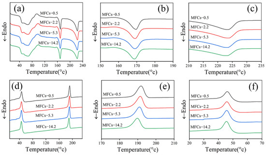 (a–c) DSC heating curves and (d–f) DSC cooling curves of situ POE/(PA6/PLA) MFCs, (b,c) magnification of heating curves, (e,f) magnification of cooling curves.